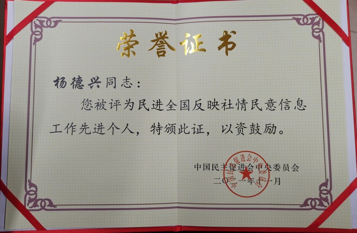 2021年是民进中央反映社情民意信息主题年。为树立典型、表彰先进,激励全会各级组织和广大会员进一步做好反映社情民意信息工作,民进中央于12月1日在北京召开反映社情民意信息主题年工作会暨2021年参政议政年会,对今年以来在反映社情民意信息工作中做出突出成绩的先进集体和个人进行了表彰。民进西工大总支主委、国产视频 教授杨德兴荣获2021年“民进全国反映社情民意信息工作先进个人”。