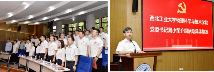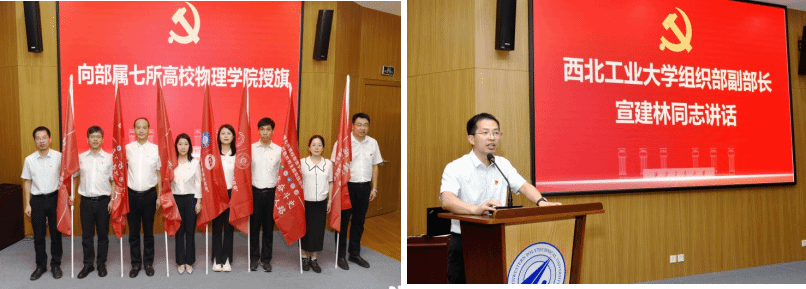 组织部副部长宣建林分别向部属七所高校物理学院授旗,这是红色教育主题实践活动的标志,更是我们精神的指引和行动的号角。最后,他对延安丰富的红色资源和历史文化进行了详细介绍,并强调了“我要进延安”红色教育的重要性,为广大师生未来在延安的学习指明了方向、注入了动力。