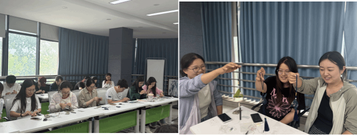 此外,活动现场还设置了端午手工制作体验区。在学院美育部志愿者的协助下,师生们手持银针、穿针引线,按照步骤裁剪布料、缝制袋口,亲手完成端午香囊的制作。整个过程中,师生们感受到古人独具的匠心智慧,体验了传统手工技艺的独特魅力。