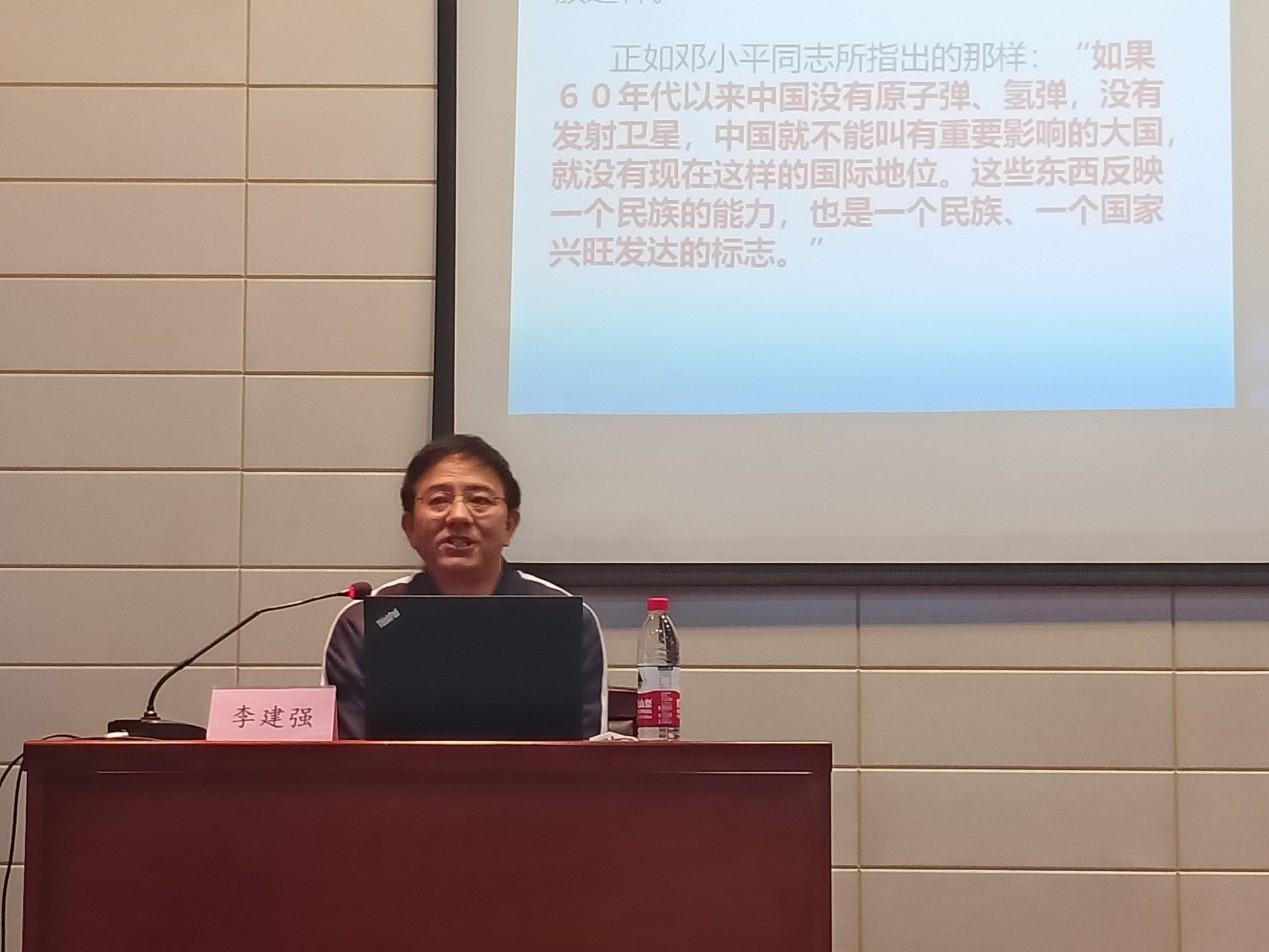 李建强副教授的报告从中国工程物理研究院建院历史开始,讲述了上世纪50年代,刚刚诞生的新中国百废待兴,面对超级大国的核威胁,为了保卫国家安全、维护世界和平,以毛泽东同志为核心的党中央第一代领导集体高瞻远瞩,审时度势,从国家前途、民族命运的全局出发,果断作出发展“两弹一星”的重大战略决策。在党中央的坚强领导下,我国科技工作者依靠自己的力量,仅用了10年左右的时间就创造了原子弹、氢弹研制成功、导弹飞行和人造卫星上天的奇迹,取得了“两弹一星”事业的辉煌成就。