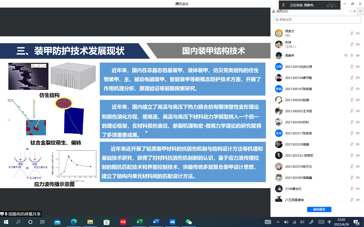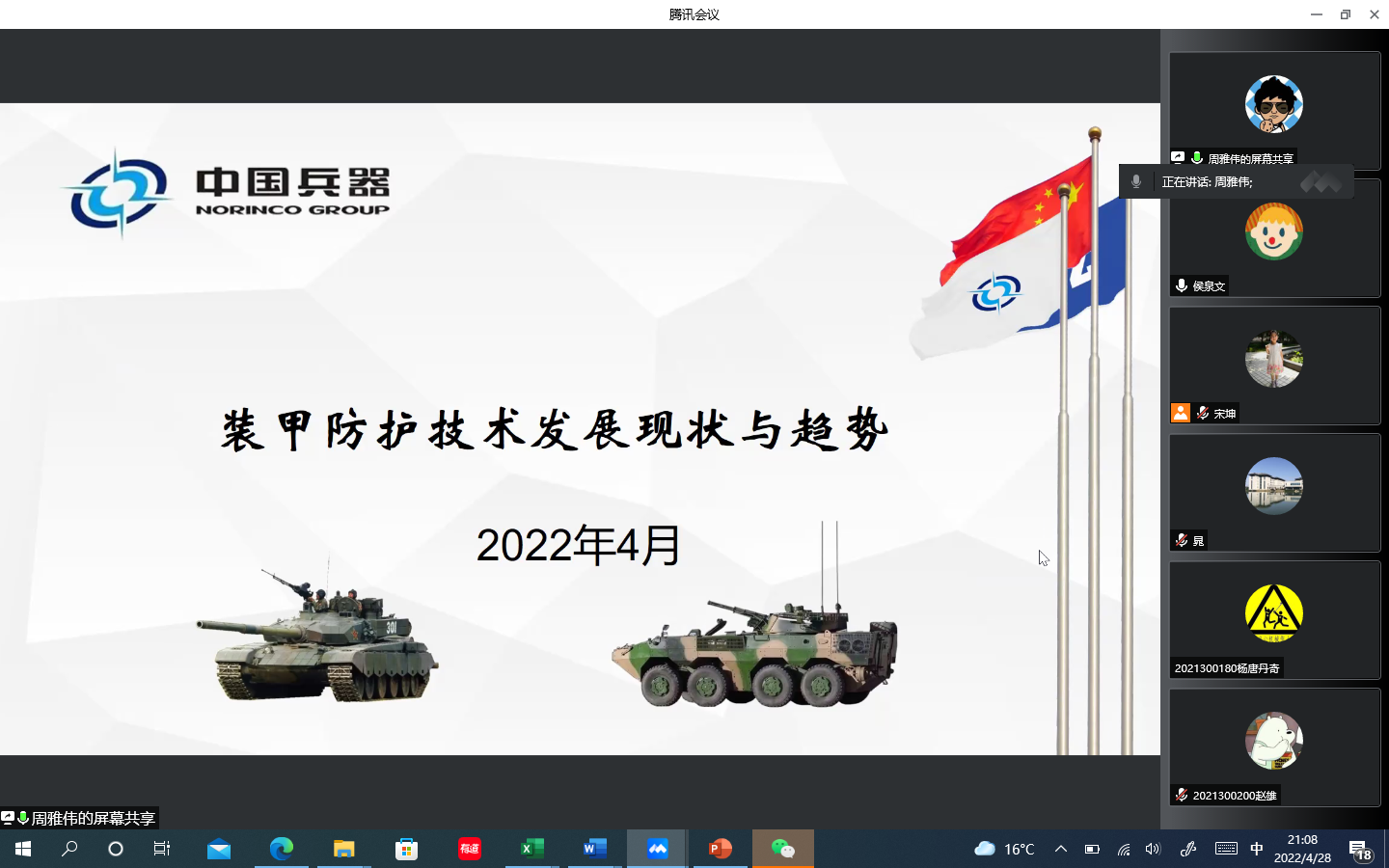 相关专业的认知能力、开拓专业视野,4月28日晚,中国兵器工业第五二研究所烟台事业部副主任、中国兵工学会军用防护技术专业委员会委员、物理学院优秀校友周雅伟高级工程师以“装甲防护技术发展现状与趋势”为题,通过腾讯会议,在云端为国产视频