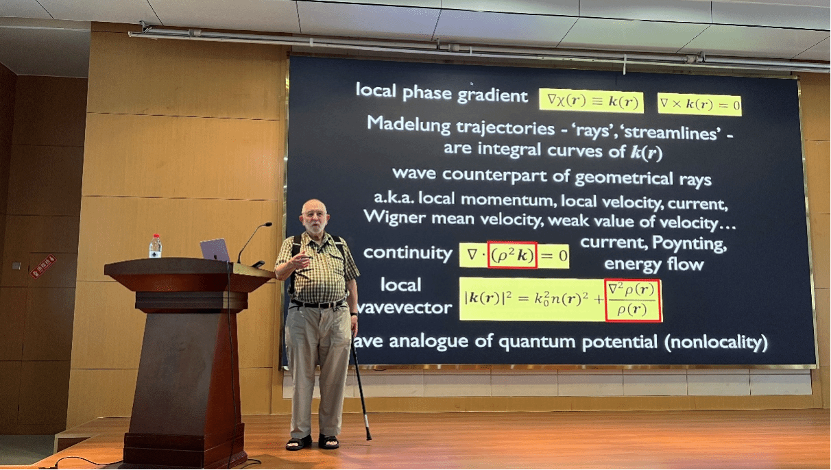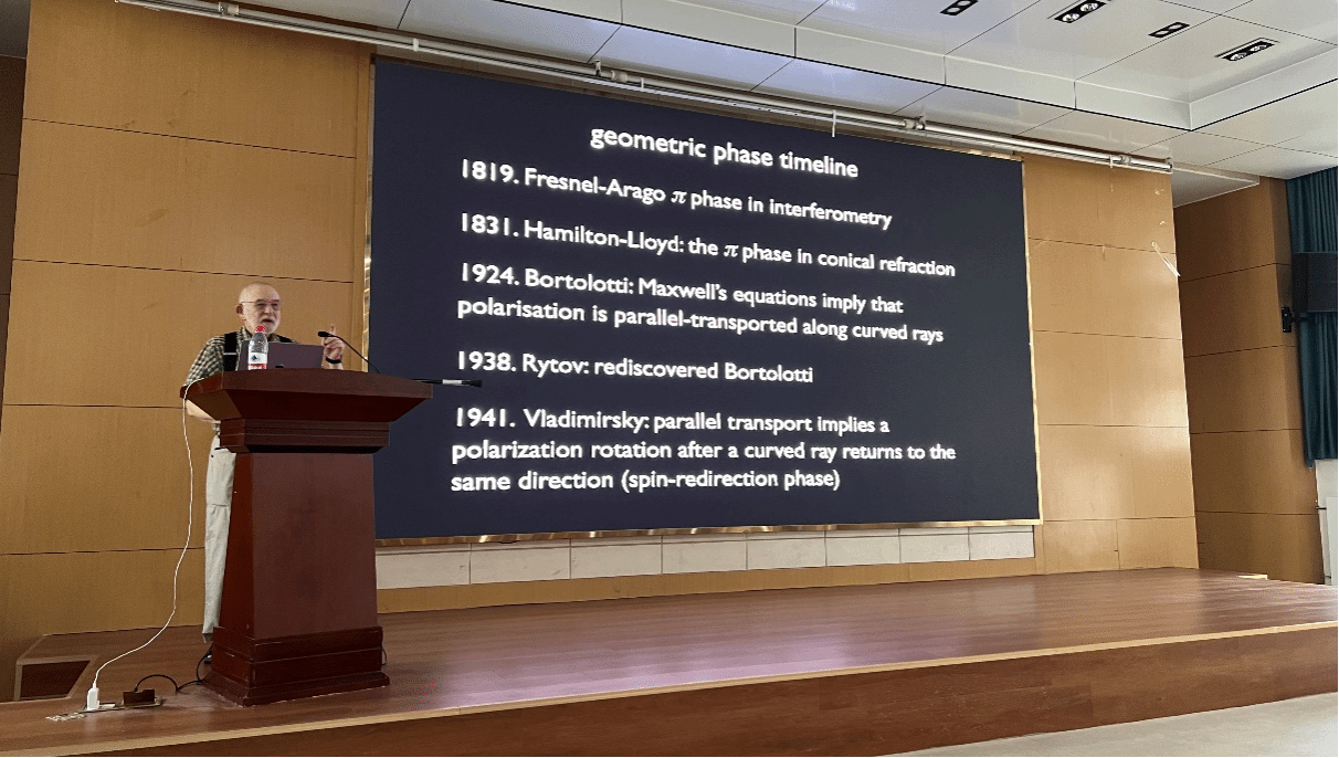 9月9日和9月11日上午,Berry教授分别以“Geometric phases old and new”和“Quantum trajectories, quantum potential, superoscillations: Madelung, de Broglie, Newton”为题作了两场学术报告,向大家介绍了几何相位两个世纪以来的发展史和量子轨迹、量子势、超振荡中的相位奇点、相位梯度、能流等数学和物理问题。9月11日晚,Berry教授与国产视频