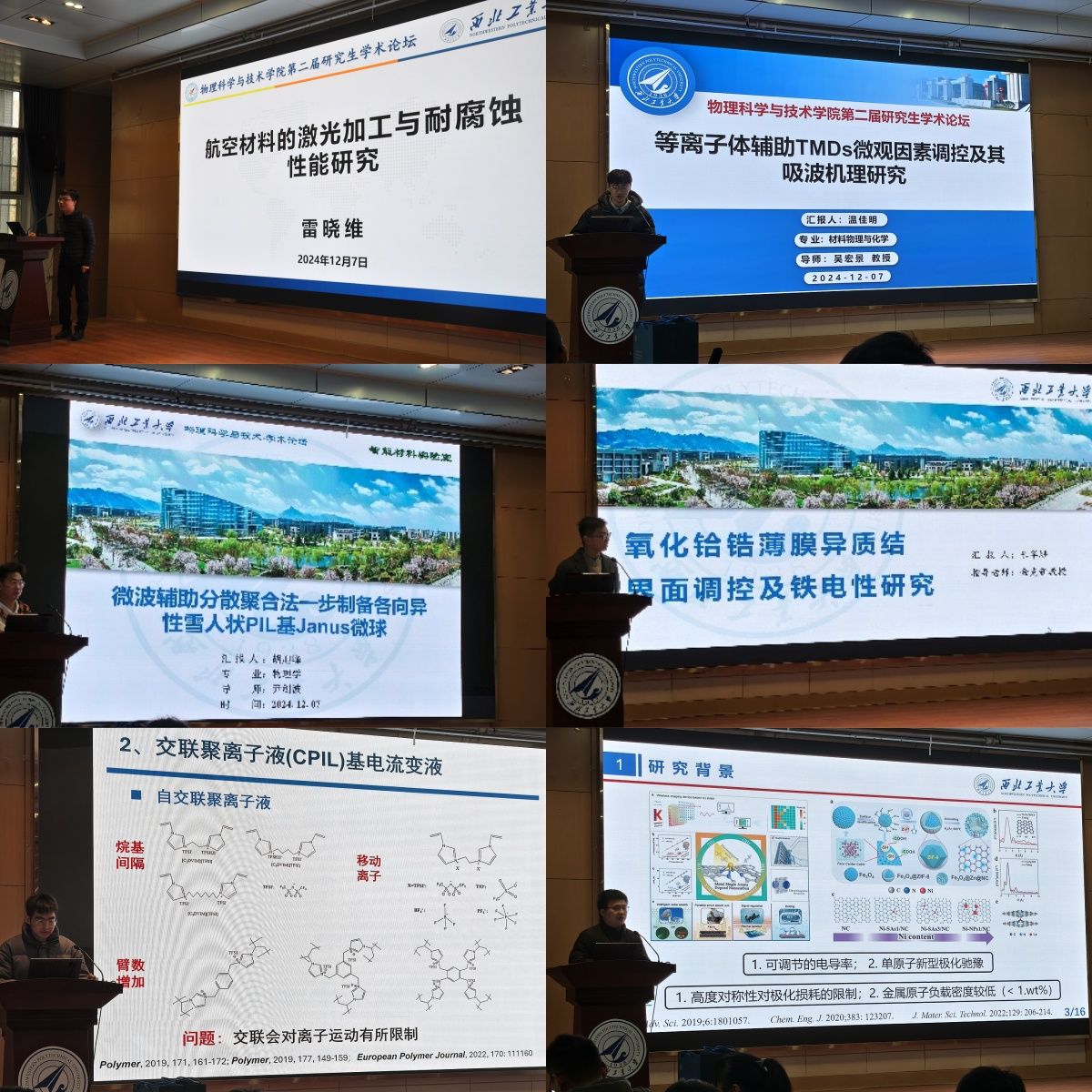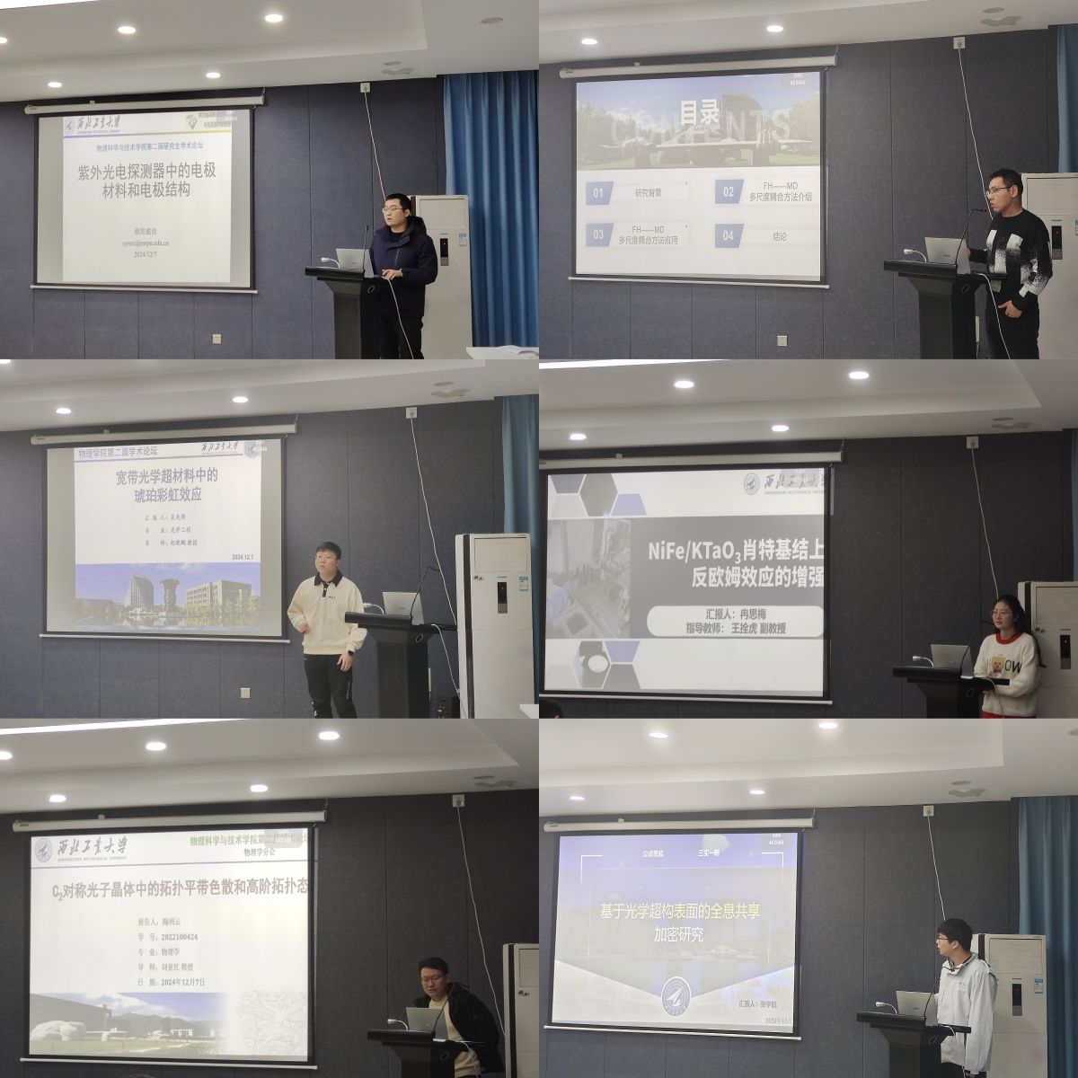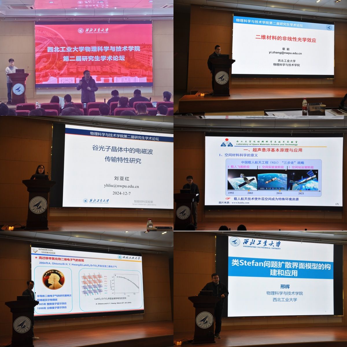 论坛伊始,由尹剑波副院长致开幕辞,宣布论坛开始。随后,章毅教授、刘亚红教授、耿德路教授、王拴虎副教授、邢辉副教授分别作了题为“二维材料的非线性光学效应”、“谷光子晶体中的电磁波传输特性研究”、“超声悬浮条件下液态合金快速凝固研究”、“复杂氧化物界面二维电输运特性及其调控研究”、“类Stefan问题扩散界面模型的构建和应用”的报告。参会师生就相关研究内容展开了热烈的交流讨论,现场学术氛围浓厚。同学们通过提问互动,不仅加深了对研究课题的理解,也收获了许多宝贵的学术建议。