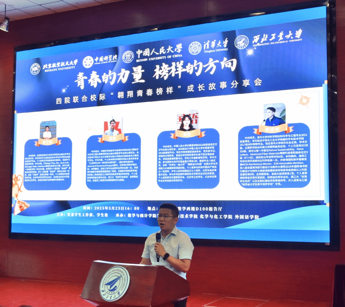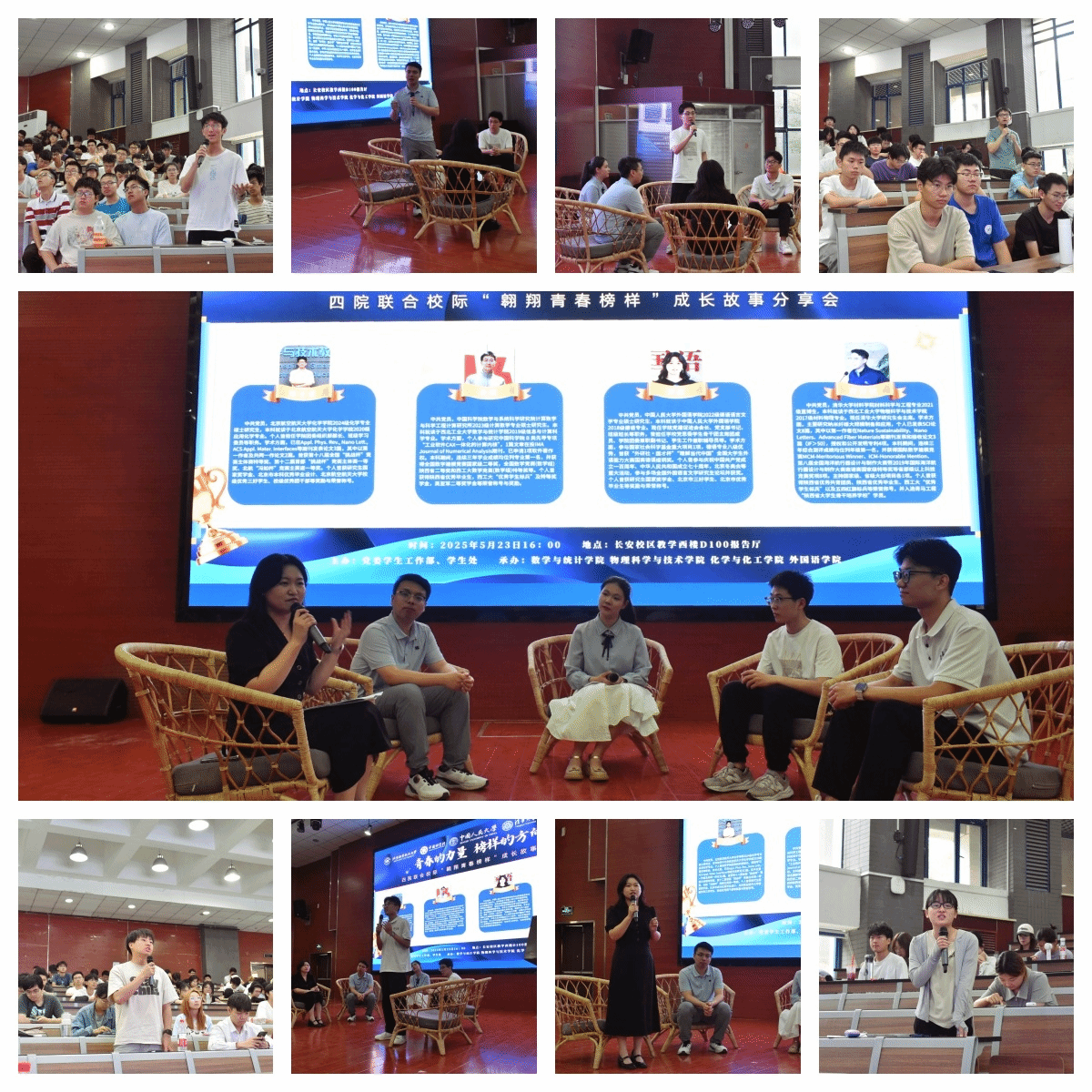 、化学与化工学院、外国语学院联合承办的校际"翱翔青春榜样"成长故事分享会在教学西楼D100报告厅举办。四位优秀学子齐聚长安校区,与同学们共话成长历程,畅谈青春奋斗的深刻体悟与宝贵收获。数学与统计学院党委副书记张莹、国产视频