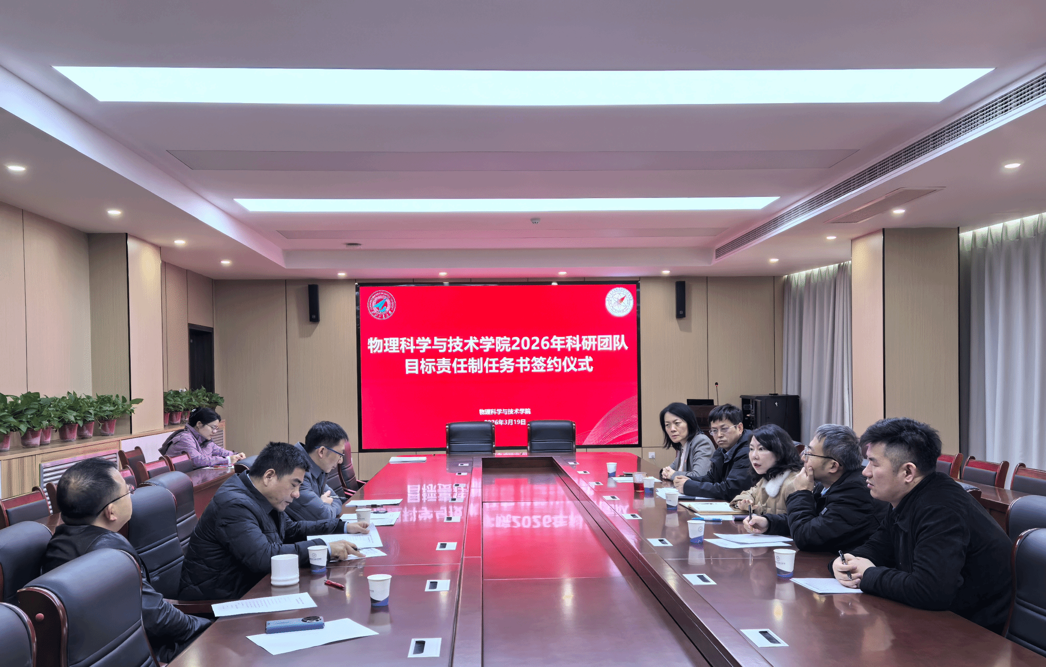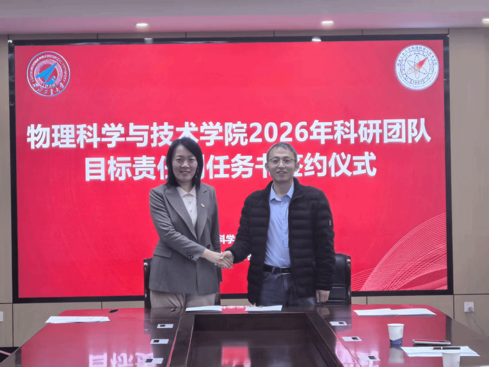 科研团队目标责任制管理办法》,对各个团队2026年度的科研和师资队伍建设任务指标进行解读,并代表学院分别与陕西省光信息技术团队、超声科学与技术团队和光基物质科学与超快过程团队负责人现场签订任务书。