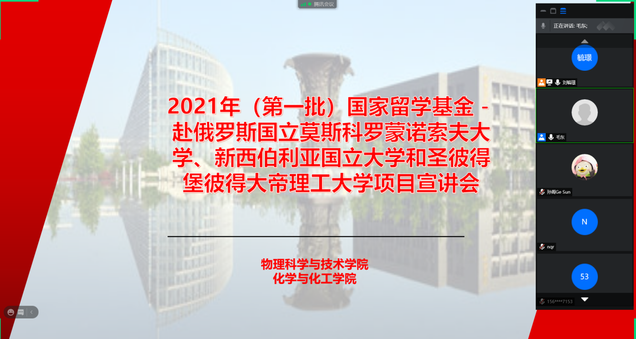 、化学与化工学院组织召开了2021年(第一批)国家留学基金-赴俄罗斯3所高校项目宣讲会。本次宣讲会与会人员有:国产视频