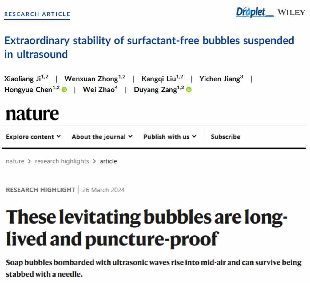 在气泡物理领域取得重要进展。研究成果以“Extraordinary stability of surfactant-free bubbles suspended in ultrasound”为题发表在国际知名学术期刊《Droplet》上(期刊封面故事),并被Nature亮点报道。论文第一作者为博士生姬晓亮,通讯作者为臧渡洋教授,本科生蒋一辰也参与了这项工作。论文链接//doi.org/10.1002/dro2.119。