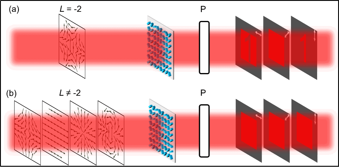 研究团队提出了基于超表面的柱矢量光束(CVB)全息术的概念,通过使用四原子像素超表面,在观察平面上重建了与入射CVB模式相对应的矢量全息图像。虽然CVB是由具有OAM模式的正交偏振光叠加形成的,但CVB全息术没有在全息图像的像素中保留OAM特性,因此可以使用准连续的方式对目标图像进行精细采样。此外,通过对出射光进行偏振滤波,可以直接观察到全息图像。实验制备了透射型介质超表面,当入射CVB的阶次为L时,通过对出射光进行偏振滤波可以观察到对应的全息图像(图1a);当入射CVB的阶次不等于L时,使用任意角度的线性偏振片对出射光进行偏振滤波,都无法观察到正确的全息图像(图1b)。