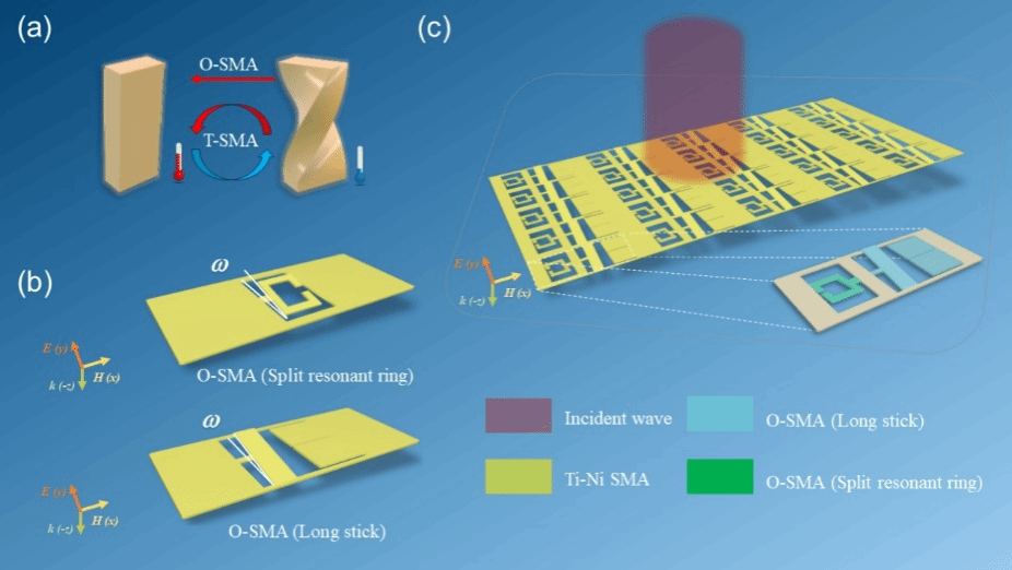 超透射(EOT)现象通过等离激元共振耦合可极大增强电磁波通过亚波长尺度小孔的透射率,在超分辨显微成像应用和近场散射物理机制研究等方面有重要价值。在过去的几十年,由于等离激元的频率限制,EOT现象主要在可见光波段实现。伴随电磁超材料的快速发展,EOT在太赫兹等波段逐步实现。目前,EOT现象往往固定在某个频点,缺乏有效的可调性能,器件尺寸通常比工作波长大几倍。实现小型化、性能可调、高设计自由度的EOT类器件仍具有挑战性。形状记忆合金(SMA)作为一种天然的温度响应材料,能够在外界热刺激下发生较大形变,展现形状记忆效应。SMA几何可重构特性为开发热可调超材料提供了独特的优势。结合SMA的自然材料特性和超材料的独特电磁响应机制,为发展性能可调的紧凑型类EOT器件提供了一个新颖的途径。