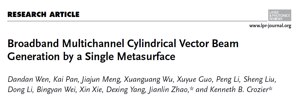 赵建林教授团队与澳大利亚墨尔本大学KennethB. Crozier教授团队合作,在人工微结构光场调控领域取得重要进展。近日,相关成果以“Broadband Multichannel Cylindrical Vector Beam Generation by a Single Metasurface”为题发表在光学类国际顶级学术期刊《Laser & Photonics Reviews》上。论文第一作者为温丹丹教授,通讯作者为赵建林教授和KennethB. Crozier教授。论文链接://onlinelibrary.wiley.com/doi/10.1002/lpor.202200206