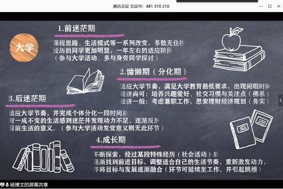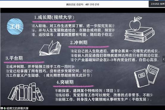 杨书记将自己的大学和工作各分为了四个时期,为同学们日后的发展提供了意见与建议。杨书记表示,作为当代大学生,不仅要敢于追求,更要对自己的未来有着清晰的认识。我们应该在学习和工作中发掘自己的兴趣爱好,并结合实际,选择适合自己的发展道路。